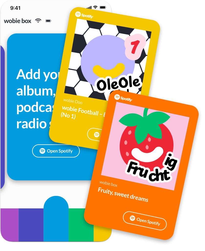 The wobie box can be easily managed and set up using the free wobie fav app, available for both iOS and Android. With the app, you can assign Spotify albums to the rainbow buttons on the box. Play Spotify directly over Wi-Fi with just one click – no smartphone required.