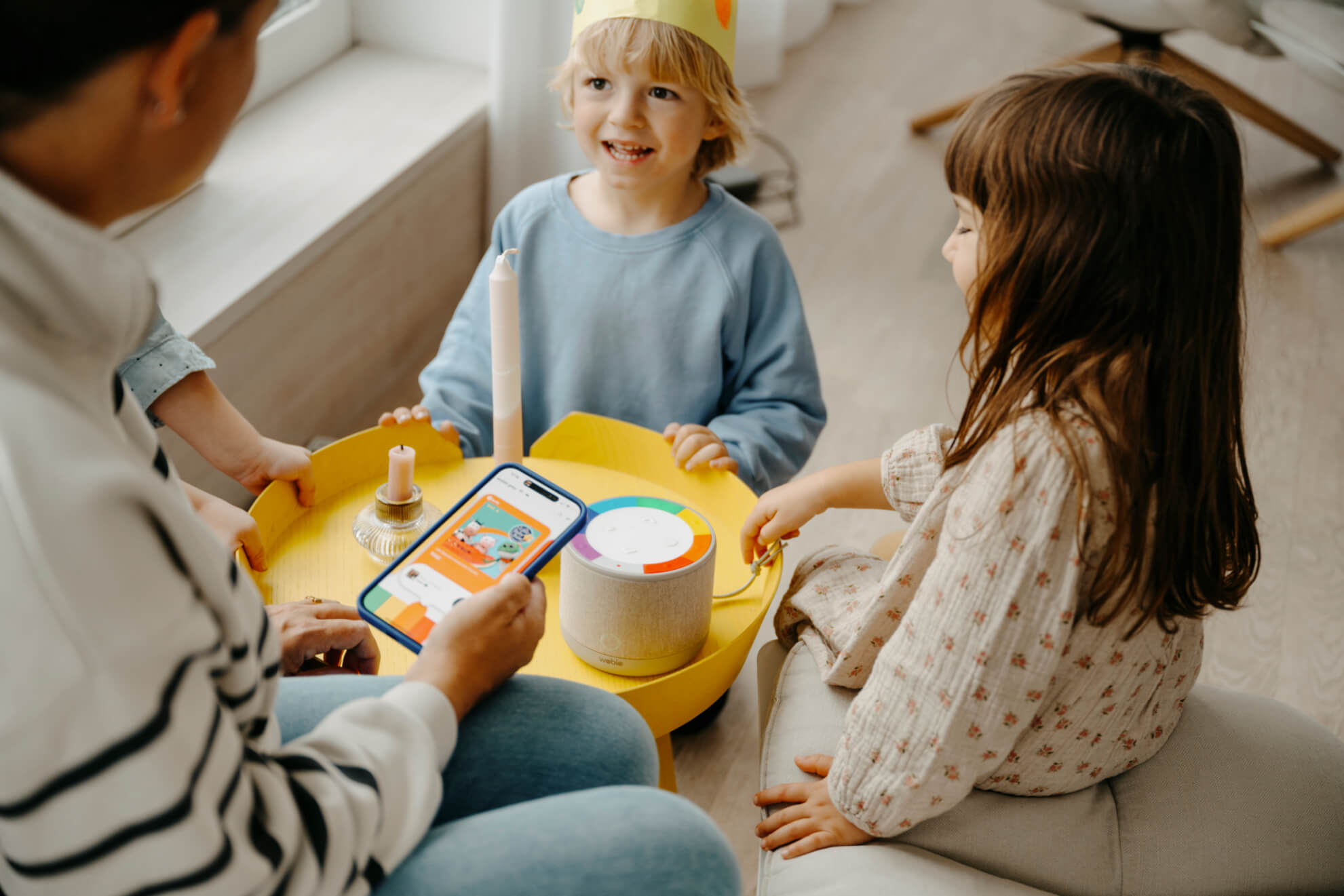 La wobie box se configure et se gère avec l'application gratuite wobie fav pour iOS et Android. Elle permet d'attribuer des albums Spotify aux touches arc-en-ciel de la box. Un seul clic suffit pour lancer la lecture de Spotify directement via le Wi-Fi, sans avoir besoin de votre smartphone.
