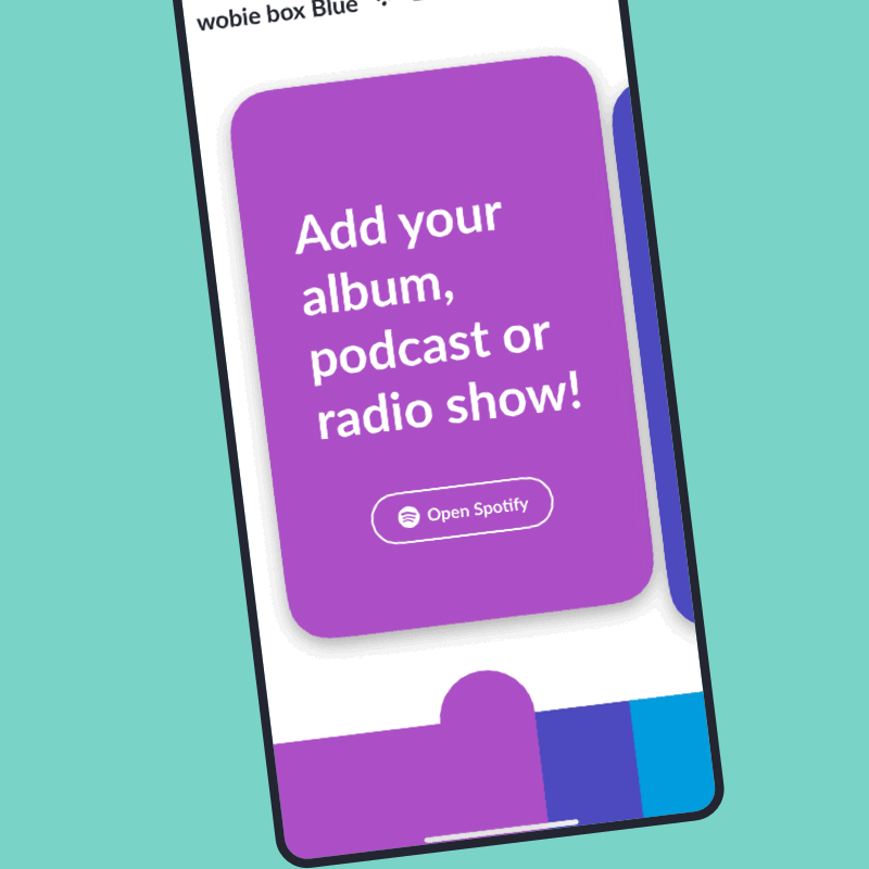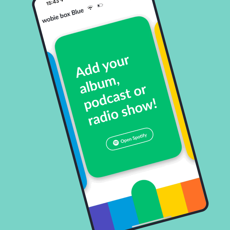 1/4Met wobie fav voor Android of iOS kun je muziek toewijzen aan de regenboogknoppen. Selecteer eerst een gekleurd kaartje in de app door naar de zijkant te vegen. Dit komt overeen met de knop met dezelfde kleur op de wobie box. Om via Spotify te luisteren, tik je op de knop "OPEN SPOTIFY". De Spotify-app wordt nu automatisch geopend.